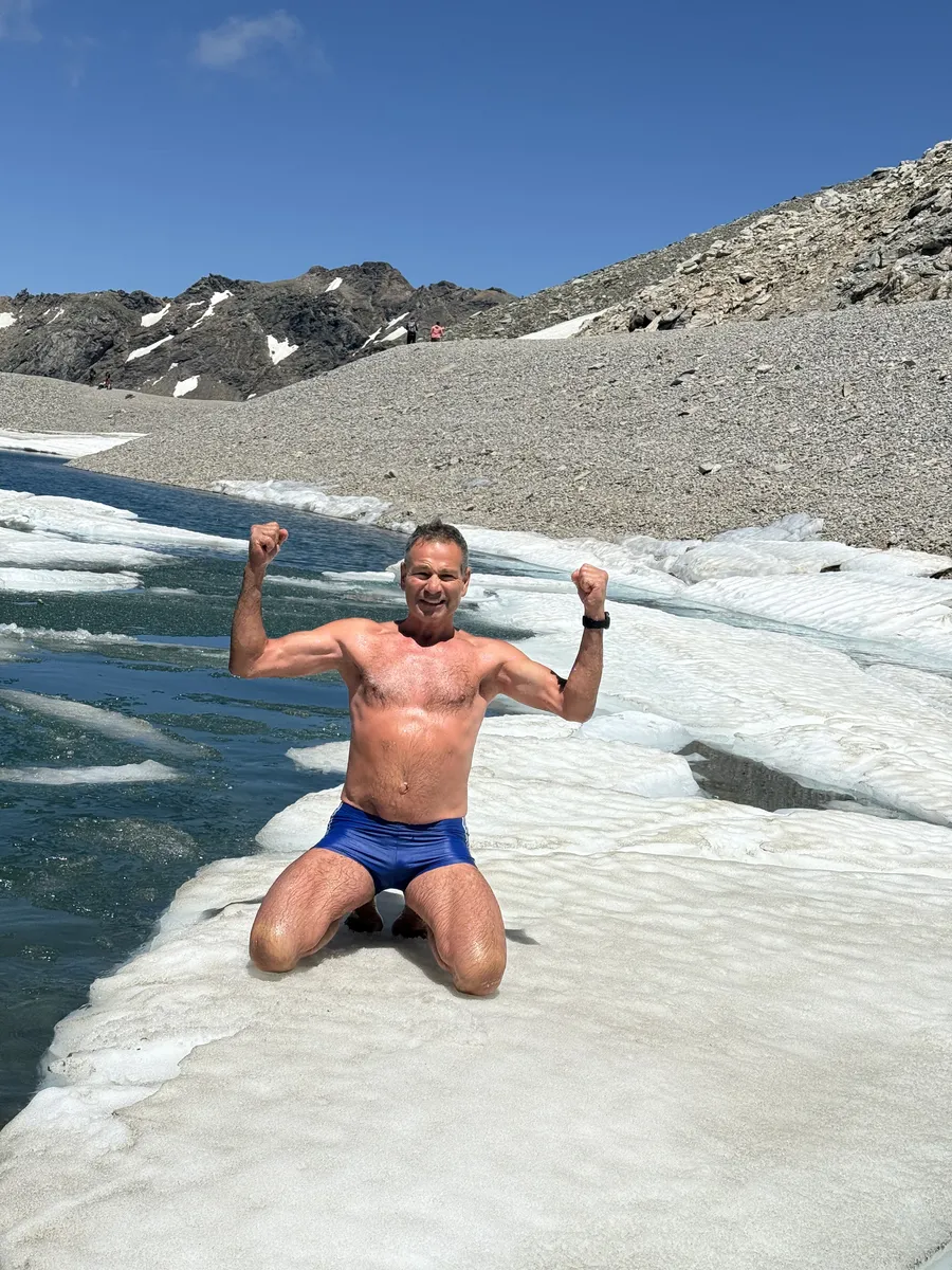 Teilnehmer beim Eisschwimmen Retreat Österreich sitzt jubelnd auf einer Eisscholle beim Kältetraining am Gletscher